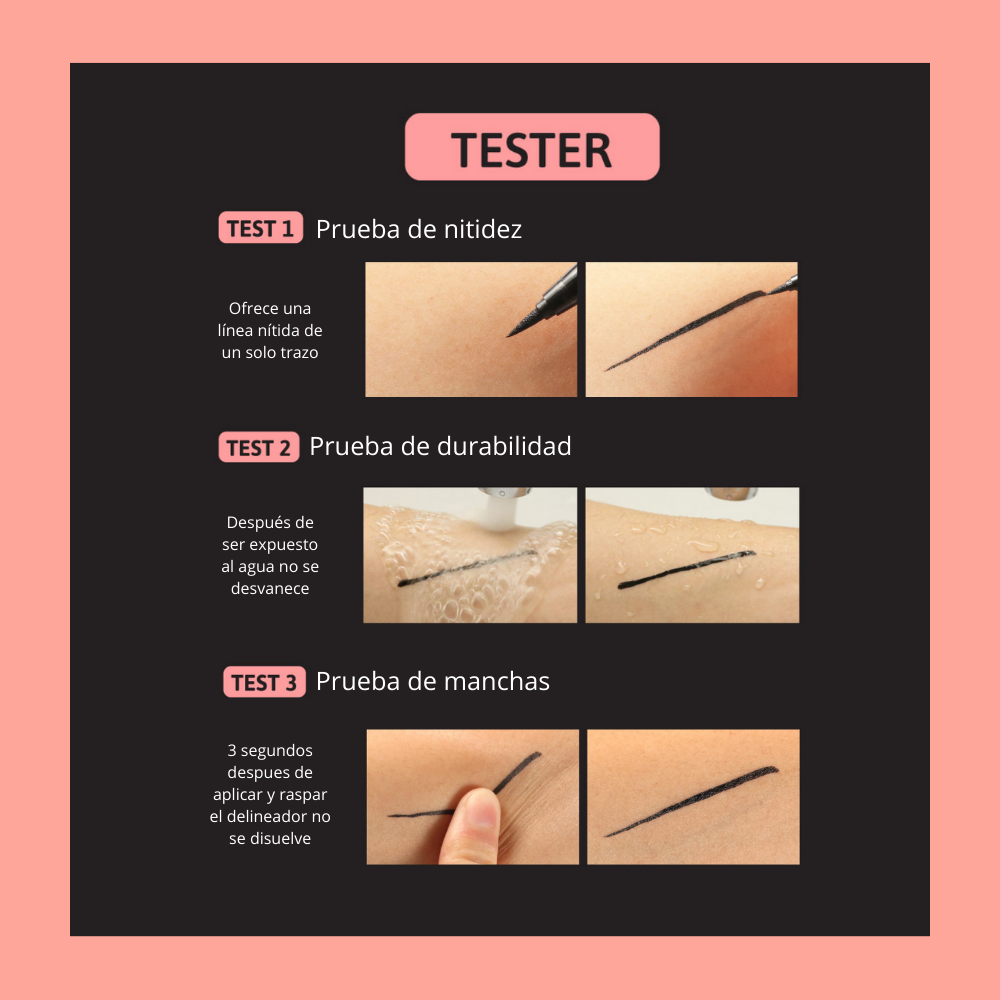 Probado en laboratorio, este delineador es resistente al agua, al sudor, a la humedad y a las transferencias. Además, su diseño suave al tacto ofrece control total durante la aplicación, haciéndolo ideal tanto para principiantes como para maquilladores expertos.